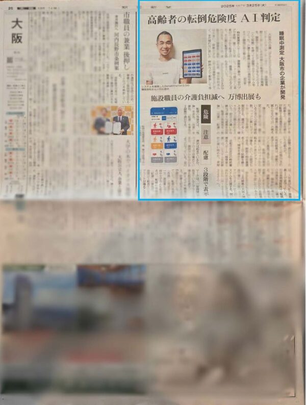 2025年3月25日付の朝日新聞(本紙・大阪版)にて、弊社Rehabilitation3.0が開発したReha3.0(リハサン)が「高齢者の転倒リスクをAIで判定するシステム」として紹介されました。