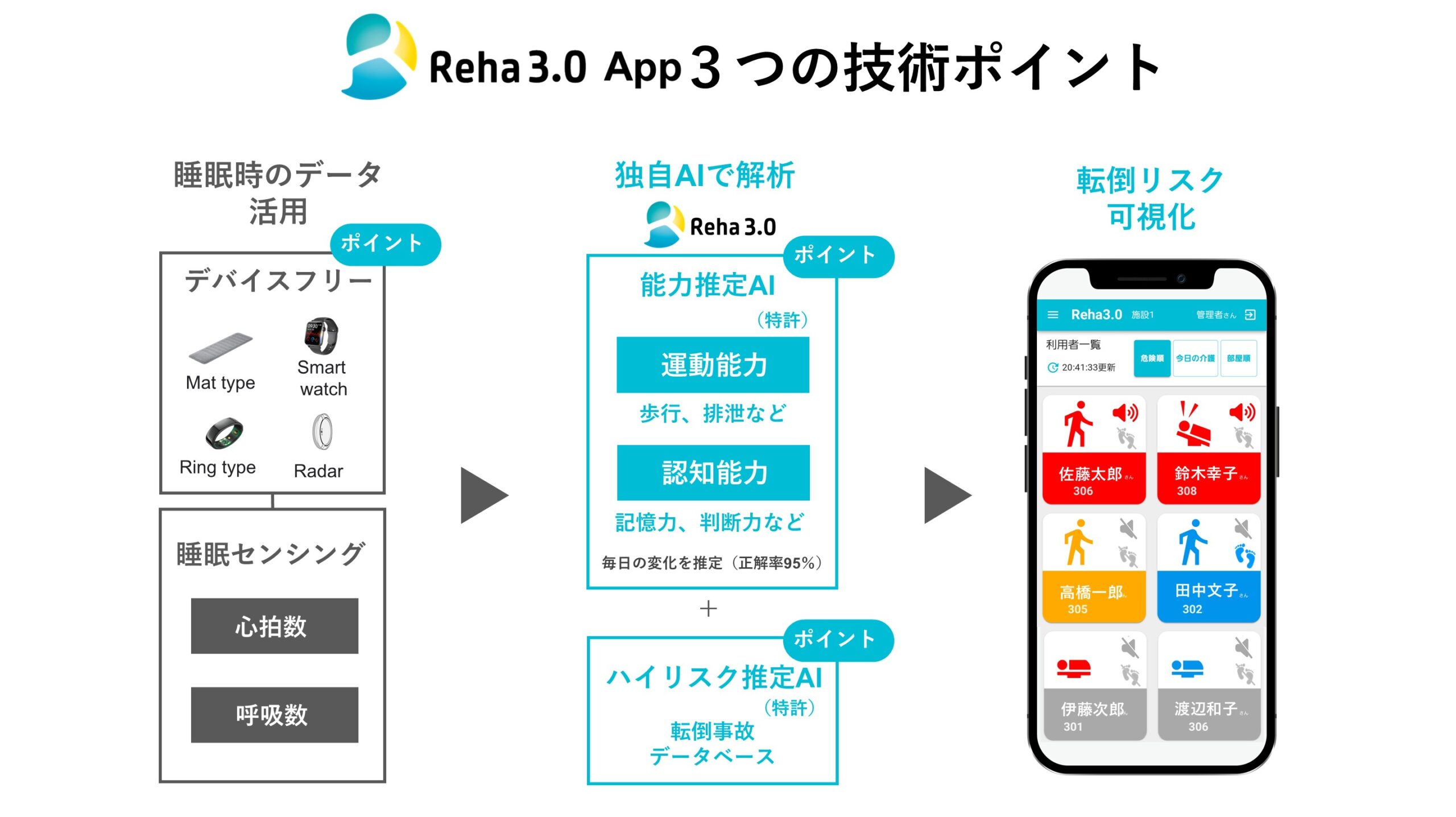 Rehabilitation3.0は、睡眠時のバイタルデータをAI技術で解析し、転倒ハイリスク者を可視化するAIアプリケーション「Reha3.0」を提供しています。Reha3.0は転倒リスクを3段階で可視化し、転倒ハイリスク者に限定してアラートを鳴らすことで、不要なアラートを減らし、見守り業務を8割削減できます。